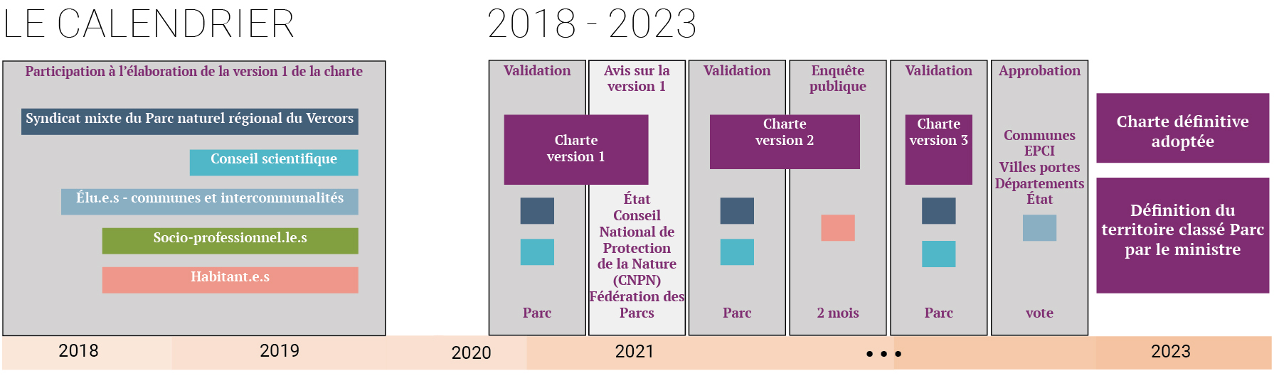 Entre 2018 et 2024, un travail a été engagé pour diagnostiquer les réalisations de la charte 2008-2023, pour rédiger le nouveau projet de territoire, le partager, l'amender et le voter. Les communes se sont prononcées sur leur adhésion à cette charte et donc au Parc du Vercors lors du 1er semestre 2024.